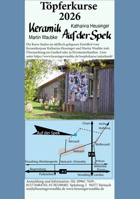 Das Keramikerpaar Katharina Heusinger und Martin Waubke führt die Töpferei Keramik Auf der Spek. Auf der Spek ist der Hausname, der Name kommt vom lehmigen speckigen Boden. Schön, in Alleinlage, am Fuße des Bayrischen Waldes (Gemeinde Steinach bei Straubing, Niederbayern) stellen sie Keramiken her.